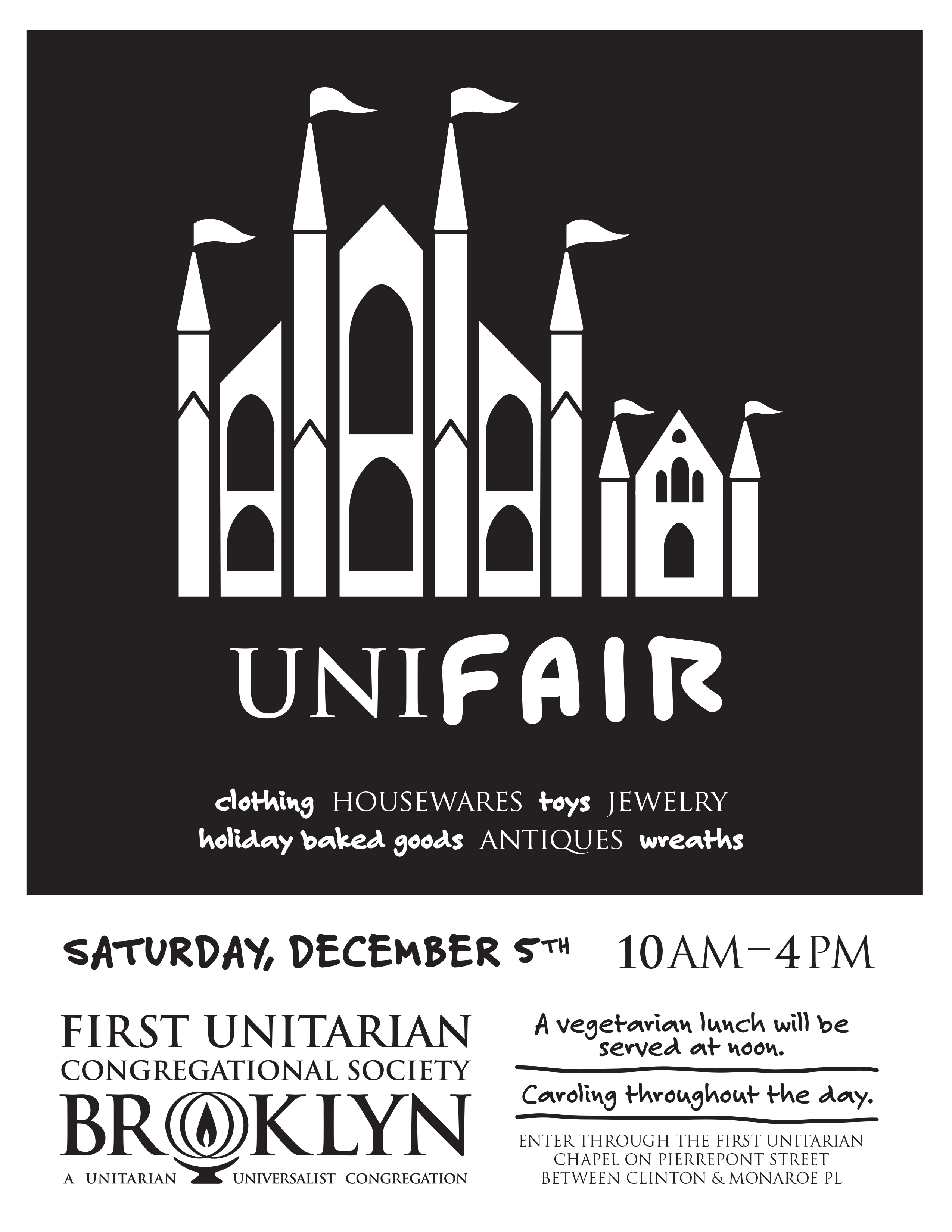 Brooklyn’s best and biggest Christmas Fair is coming back to First Unitarian! UniFair has been a highlight of First Unitarian’s holiday season for more than three decades and has raised over $300,000 towards our congregation’s programs and mission. Donations of clothing, household goods, jewelry, books and media (no VHS tapes please) are now being accepted. Donations can be brought to the church office Monday through Thursday or to the Undercroft on Sundays (enter through the 50 Monroe Place door). If dropping off during the week, please call ahead (718-624-5466) to make sure someone is available to receive you. Besides used items, UniFair shoppers can purchase delicious and lovingly made baked goods and both decorated and undecorated holiday wreaths. A delicious lunch made with sustainable ingredients will also be available for both shoppers and workers. As a special treat, carolers will entertain throughout the day. More information: garnett@fuub.org