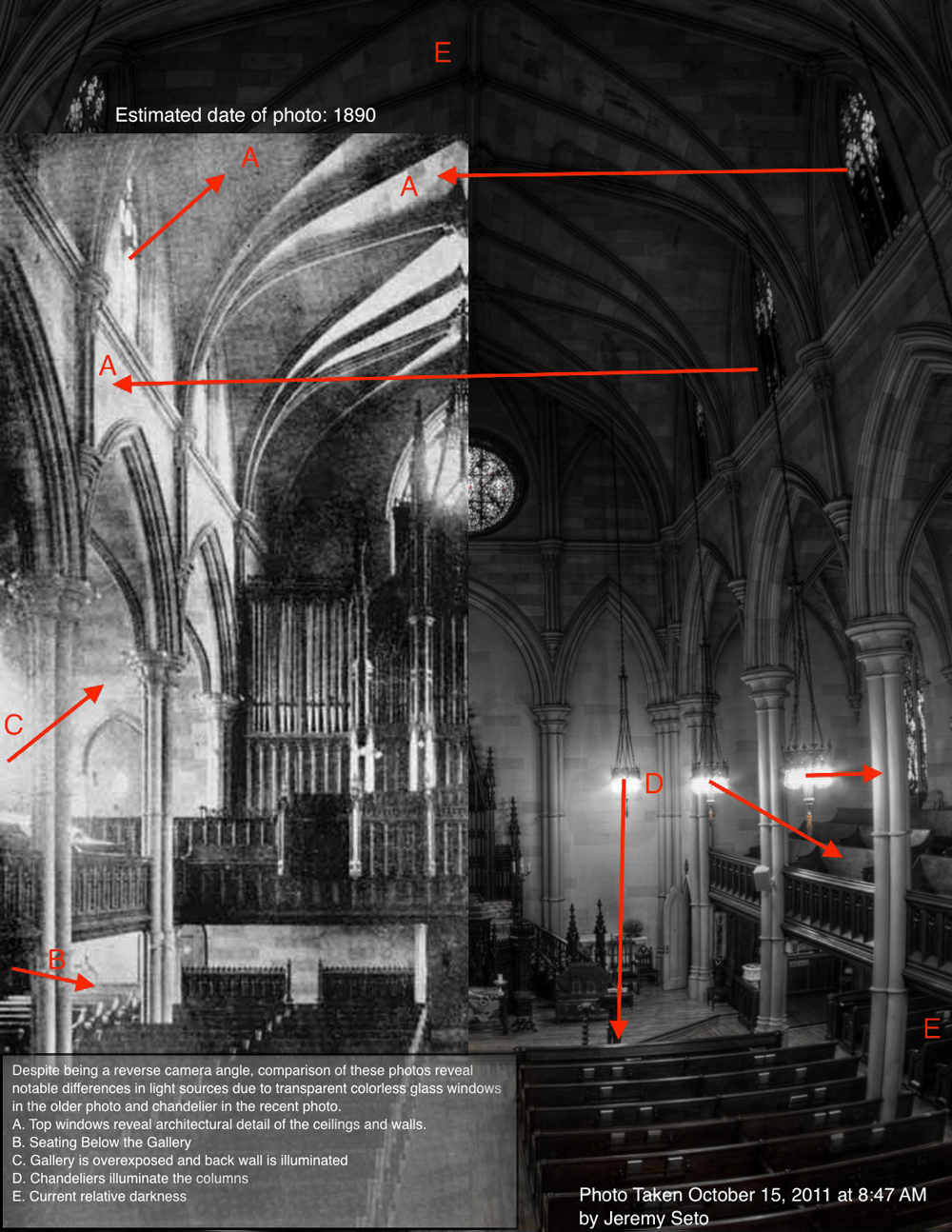 This image compares the light in the sanctuary before and after stained glass windows were installed. (Click to enlarge)
